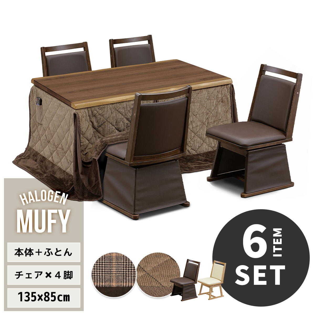 ウォールナット突板 ハイコタツ/ローコタツ切り替え可能 幅135(6点セット)